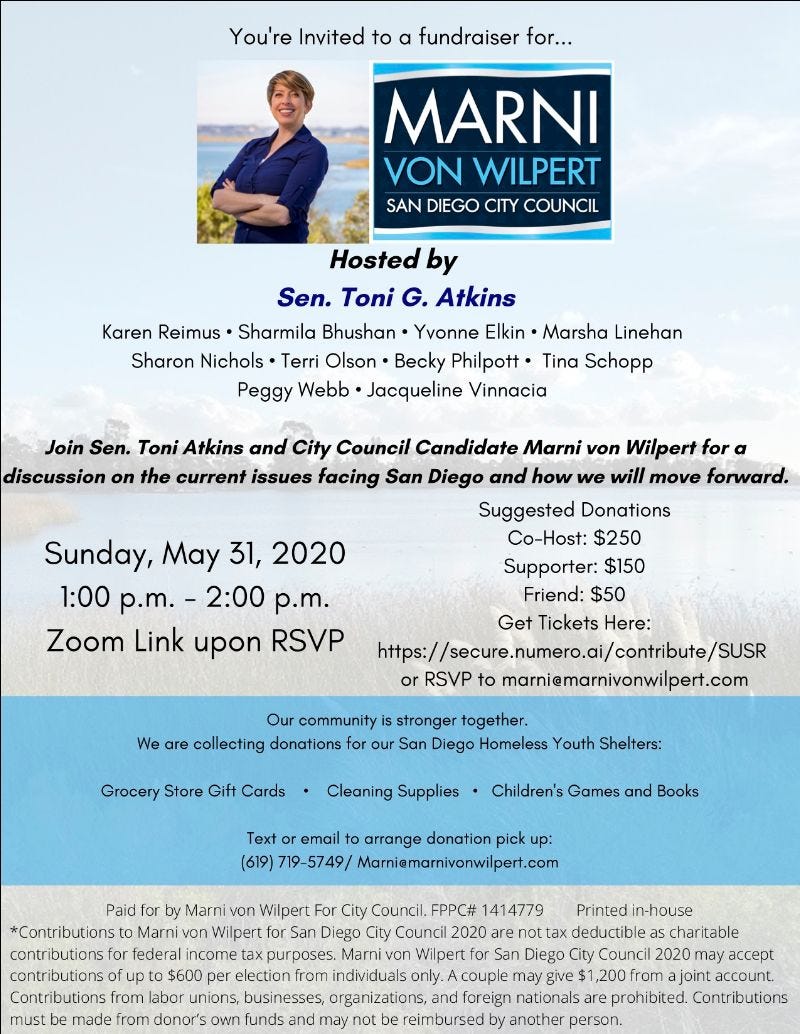 I would like to invite you to a virtual fundraiser for Marni Von Wilpert, candidate for City Council District 5. She won the March primary, and now really needs our support to push forward and flip this City Council seat from red to blue. I am co-hosting with my friends from Stand Up Scripps Ranch and would love it if you can join us.