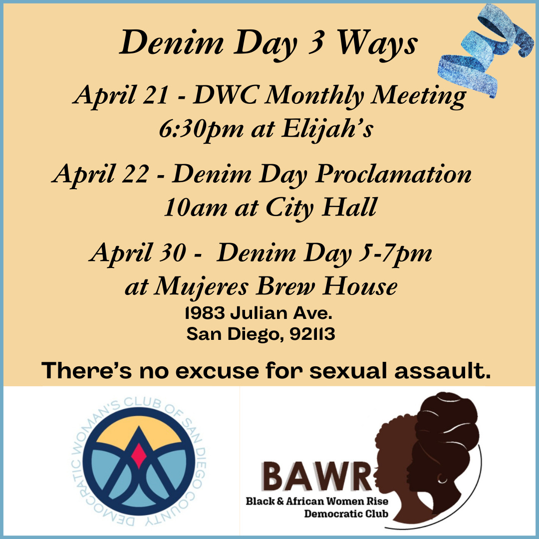 Then, on Tuesday, April 22 at 10am, our members have been invited to City Hall to stand in support of the Denim Day Proclamation! Join us along with City Attorney Heather Ferbert, Council President Joe LaCava, and Mayor Todd Gloria as they co-present the proclamation. Wear your denim and be in included in the group photo.